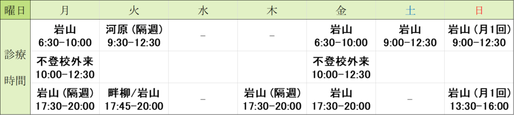 専門は、岩山(成長・夜尿症・不登校)、畔柳(夜尿症)、河原(成長)です。学会出席等により、休診となる場合がございます。